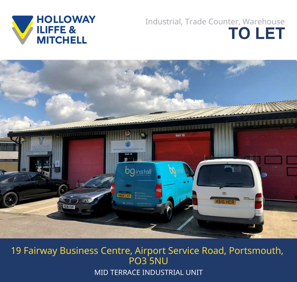 MID TERRACE INDUSTRIAL UNIT ON AIRPORT SERVICE ROAD – 1,784 sq.ft. at £21,000 pa. The property is located on the busy and popular Airport Service Road which links directly to the Eastern Road, offers industrial unit with mezzanine office floor and allocated parking. All enquiries to: tom@hi-m.co.