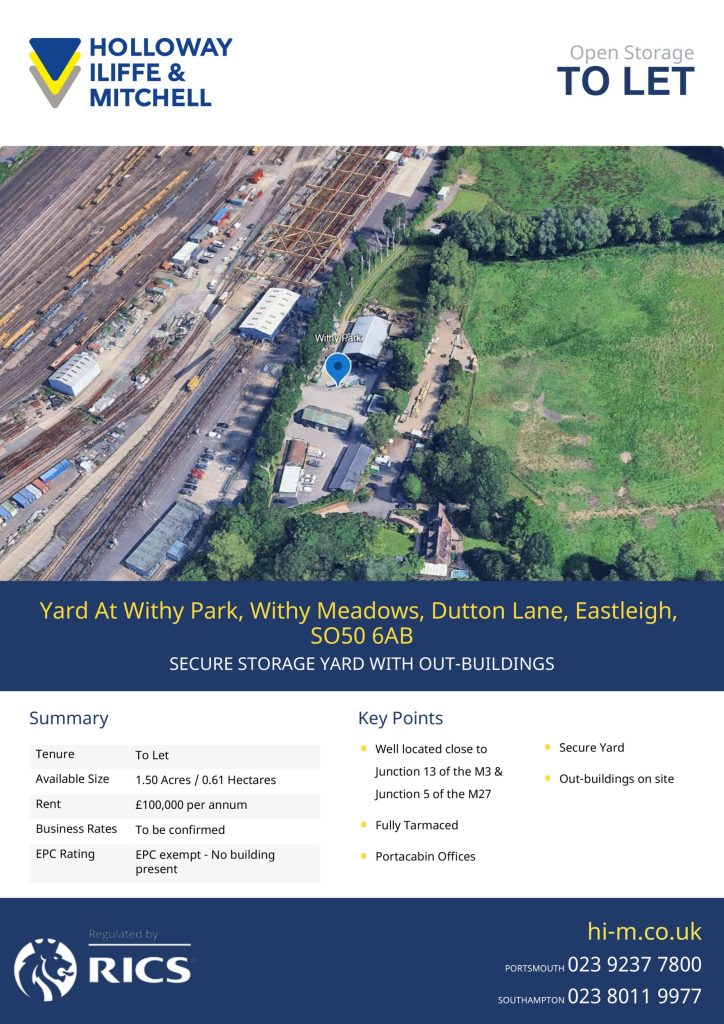 Secure yard with out-buildings to let in Eastleigh. 1.50 acres, well located close to J13 of the M3 and J5 of the M27. Available for storage purposes with fully functional temporary office. Contact: tom@hi-m.co.u