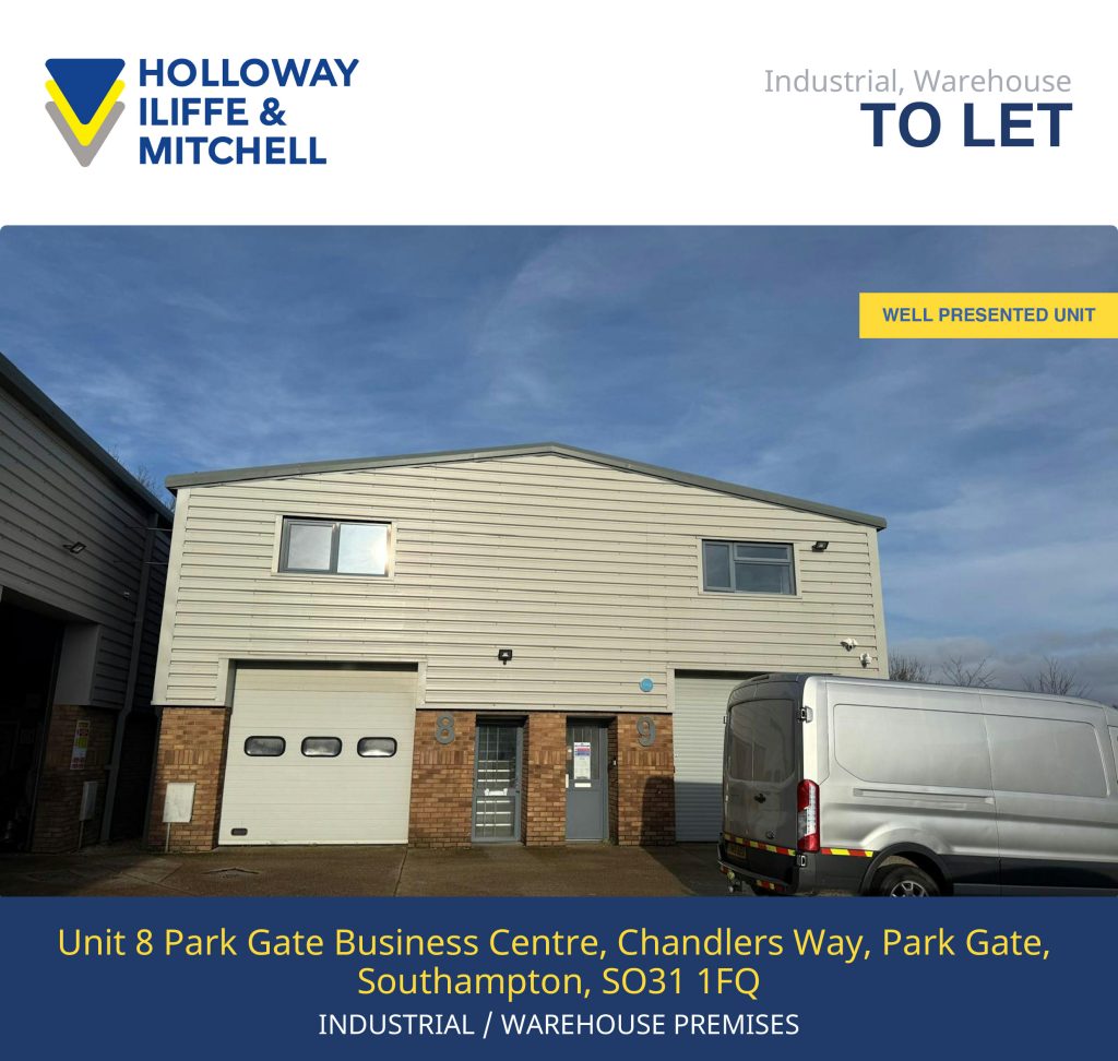 PARK GATE BUSINESS CENTRE – Southampton industrial/warehouse to let. 1,172 sq.ft. at £13,500 pa comprising modern industrial unit, first floor offices, on-site parking and located close to junction 9 of the M27. Contact: tom@hi-m.co.uk