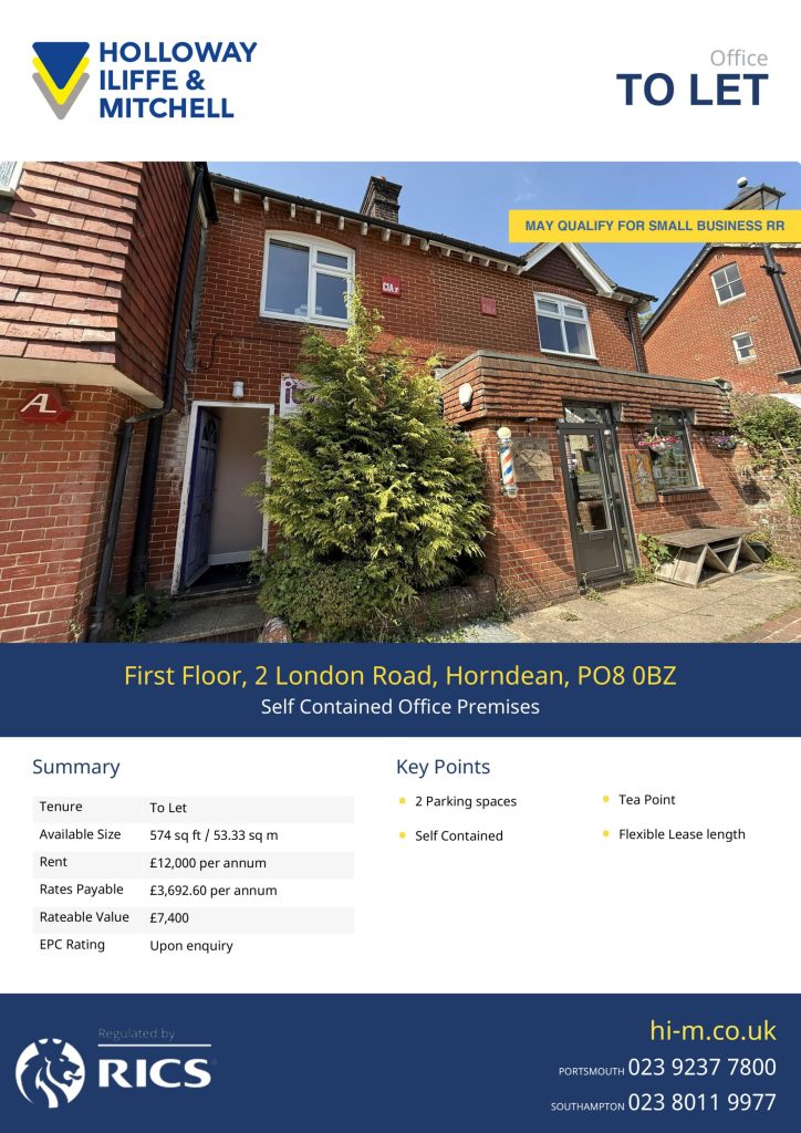 *** NEW INSTRUCTION *** To let 574 sq.ft. self contained first floor office with 2 parking spaces. The property is situated in Horndean village centre on London Road, leading to Waterlooville. All enquiries to: tom@hi-m.co.uk